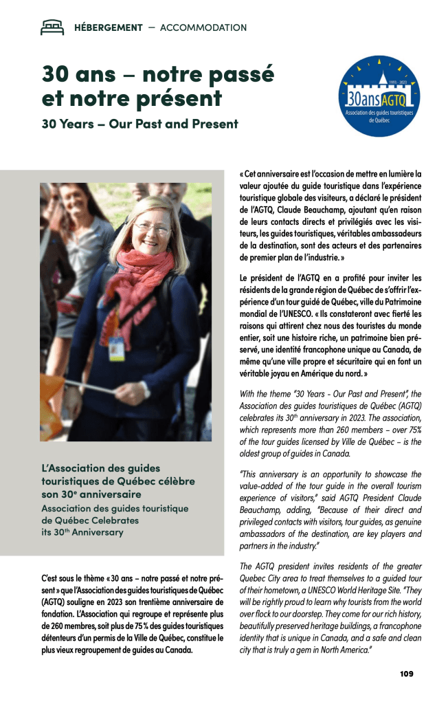 En 2023, l’Association des guides touristiques de Québec – AGTQ avait célébré son 30e anniversaire de fondation. Elle figure parmi les plus anciens regroupements dans le domaine du tourisme en Amérique du Nord ! Pour souligner cette année de grande importance dans la vie d’association professionnelle, nous avons développé le concept marketing pour toute l’année de l’anniversaire en 2023 sur la visibilité médiatique de l’AGTQ.